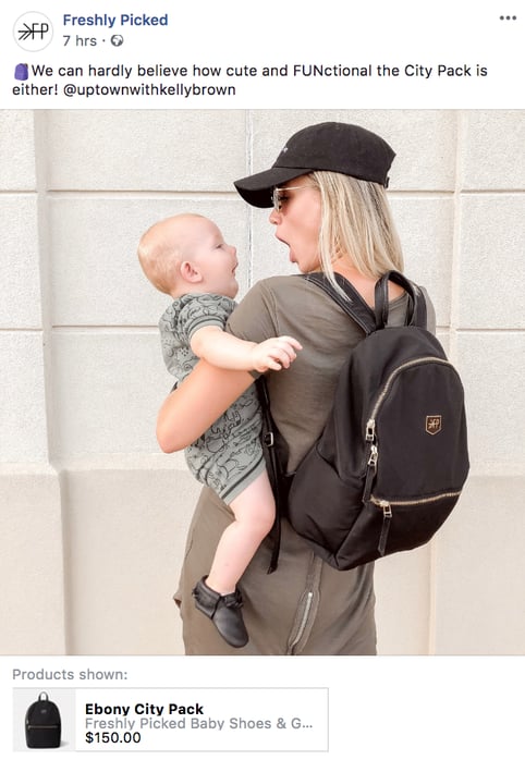 Freshly Picked uses their customer’s content to interact with their members and moms over multiple different platforms. They promote their products using photos that mothers post of their children online in the shoes using the brand’s personalized hashtag. This not only displays their product in action, but secures for others that people like and trust their brand.